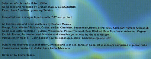 Massonix - Subtracks Order from: Skam Records (Bleep), Boomkat (Digital), Amazon ![]() Massonix - Subtracks JP 2006 CD; Beatnik / Skam: BRSK 080 / SKALD 080 [With OBI] Tracklisting: 04:15 Port Silat (Off Port Silat) Release Date: 5th December 2006. Credits: Selection of sub tracks, 1996-2006. Composed and recorded by Graham Massey as MASSONIX, except track 5 written by Graham Massey/Colin Seddon. Formatted from analogue tape/cassette/DAT and ProTools. Alll synthesizers and drum machines by Graham Massey: Moogs, Arps, Waldorf, Rolands, Casios, em&M, Oberheim, Sequential Circuits, Nord, Akai, Korg, EDP Yamaha Quasimidi. Additional instrumentation by Graham Massey: Guitars, Vibraphone, Pocket Trumpet, Bass Clarinet, Bass Trombone, Astroban, Organs, Electric Pianos, Percussion and Balsalaika and Hawaiian guitar. Percussion on track 5 by Colin Seddon: Surdo, Repanique, Caxixl, Berimbau, Djembe, etc. "Pulsars" was recorded at Manchester Cathedral, and is an Akai sampler piece. All sounds are comprised of pulsar radio transmissions received at Jodrei bank Radio Telescope. Cover art by Emma Beech. Ordering: Order Subtracks from Boomkat or Skam. Discussion: ![]() Massonix - Subtracks - UK CD - Back