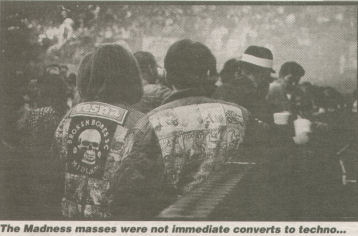 Is there life beyond the rave? Too right as 808 STATE discover when they confront the rough end of the rock audience with their synths and samplers on the Madness tour and come face-to-face with the golf-club wielding Hibs Casuals in darkest Edinburgh. IAN McCANN joins in with the brown trousers, pineapple marking and mountains of widders. Art of the State: LOUISE RHODES ![]() Backstage at the NEC, it's plain to see the nerves on Graham Massey's face. "He's always like that," says Darren Partington dismissively, as confidentially as a naturally garrulous, outgoing lad can be. "That's what he's like." However, despite being initially loath to mention it, and then reluctant to go into detail, it seems clear that last night's gig in Edinburgh has affected Graham today. From time to time a recollection of yesterday, recounted in the sort of excited, disbelieving voice with which you might recall a nightmare, slips from the lips of a member of 808 State. Thus far in their career we've had 808 State versus MC Tunes, 808 State versus New Order, and, currently, 808 State versus UB40 for their strange version of 'One In Ten'. However, none of these challenges has troubled their natural Mancunian cool like 808 State versus The Hibs Casuals. "Do you think it was pre-planned?" someone asks. "Pre-planned?" scoffs Andy Barker, the third member of the 'band'. "Naw, they were only running round with golf clubs and baseball bats." Here in Birmingham for the last two nights of Madness' one-step-beyond-a-comeback tour, 808 State are learning the facts of rock road life. "We're still young in this," says Darren. "It's been a bit of an eye-opener." If you can call being locked in your dressing room an eye-opener, that is. It all went horribly wrong for 808 State in Edinburgh. "It wasn't so much us," figures Darren. "They'd come because it was a football crowd event. Madness attract that sort of audience. So the Hibs Casuals decided that they'd make a mark, let everyone know they're there. You know, like, 'We took The Madness'. All these blokes came running through the crowd with golf clubs and security barricaded us in our dressing room." There's a look on all three members' faces that suggests it was brown trousers time. 808 STATE are the second act to feel the sharp edge of Nutty Boys' fans' Sta-Prests since Madness decided to return. Morrissey was, of course, the first, barracked and pelted off at the first of two Finsbury Park comebacks. But while it was always a vanity for Morrissey to be part of the bill - flirting with rough boys doesn't necessarily get you embraced by them - 808 State are under no such illusions. Madness' audience, like that of fellow support act, The Farm, is a sing-song crowd. They're out for a chant and a stomp-along to tunes they've known and loved for years, from 'My Girl' to 'All Together Now'. But 808 State, despite having had a string of hits, don't fit the bill. 808's hits aren't songs, but what was once quaintly called instrumentals. Techno instrumentals to boot - up to a point, at least. And as any fool knows, an ageing football crowd can't sing along to a techno instrumental. The question is, what the f— are 808 State playing at? Russian roulette? Here they are, a respected hit-making act playing bottom of the bill to two groups with followings that really couldn't care a damp fart about dance music. What's more, there's probably very little money in it. Are 808 State bloody berserk? "You don't expect to be away for a year and then walk straight back in where you left off," says a slightly hoarse Darren. "I know a lot of bands would've turned this down flat and a lot of people have said, 'Why aren't you second on the bill?', but it's not a matter of that. It's a matter of taking dance music elsewhere, in front of a 90 per cent rock audience." "At least, that was the idea. It hasn't really worked out that way," demurs Graham. You've done gigs that are almost as big as this in your own right... "Yeah, and we could easily opt out and just play raves," says Darren. "But then you're not doing anything for the scene, are yer? There's not many people who have got a passion for the dance scene now, they're just milking it. Anyway, we're small fish when it comes to touring." "People take it all far too seriously," reasons Graham. "Madness offered it to us so we took it. What else would we be doing otherwise? Sitting in front of the telly. It's interesting to see how people still regard dance music as an alien thing." ![]() Maybe it is interesting, but it's not worth getting a five iron wrapped around your skull just to find out. 808 STATE are inbetweenies. Techno aficionados are a little snotty about them, maybe because 808 are quite happy to do the occasional rock collaboration - with Bernard Sumner and Bjork Gudmundsdottir on the 'Ex:el' album, for instance - and because their sound always had hip-hop's breakbeat element long before it was fashionable. The rock audience, meanwhile, are none too sure about them. Although Graham can be found swinging an axe or blowing down a soprano sax onstage, there's always this odd suspicion that 808 aren't a 'proper' group. After all, they use synthesisers and samplers, and don't write 'songs'. It's strange that this idea should persist, since Madness use a powerful computer sequencing system onstage, as do The Farm. Christ, you'll even find a sampler among Ned's Atomic Dustbin's stage gear, and if they can use one, it's certainly not 'cheating'. There's a third accusation that might be levelled at 808 State. That they were part of 'Madchester', a now officially defunct scene. Which means... the mild. sensible Andy Barker as Bez, anyone? The affable Darren as Shaun? No chance. This lot were never part of the groovy train. So what are 808 State? They admit to being "faceless", but that doesn't stop them from trying to take dance music to rock crowds, and their stuff is certainly a studio creation, but then again, whose isn't? "People think r